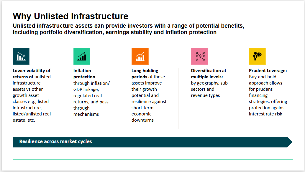 - Low correlation: Infrastructure returns tend to be less correlated with traditional public markets, offering diversification benefits.