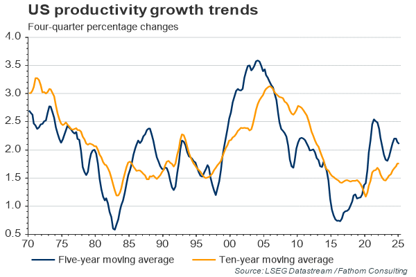 Alone among those economies that suffered a severe banking crisis through 2008 and into 2009, the US moved swiftly to recapitalise its own deposit-taking institutions. That was progress indeed. It is why US banks are lending again, and it is why, in productivity terms, the US has outperformed more or less every major economy since the Great Recession came to an end, which is what our first chart shows. The ‘but’ is that, although in relative terms the US has had a good recovery, in absolute terms it has not. As our second chart shows, US productivity growth tends to move in long cycles of booms and busts. Whether we look over the past five years, or whether we look over the past ten years, US productivity growth is close to as weak as it has ever been.
