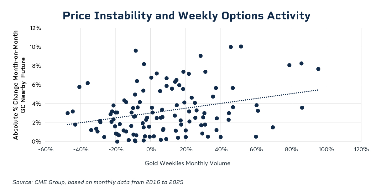 An analysis of the statistical relationship between price instability (measured in absolute percent differences in prices of the active contract from one month to the next) and activity in weekly options reveals a statistically significant positive correlation. It suggests that traders are more active in weekly options when the gold price is volatile. While the correlation is moderate, the signal is robust and illustrates how the market uses short-dated, weekly options during volatile market environments.