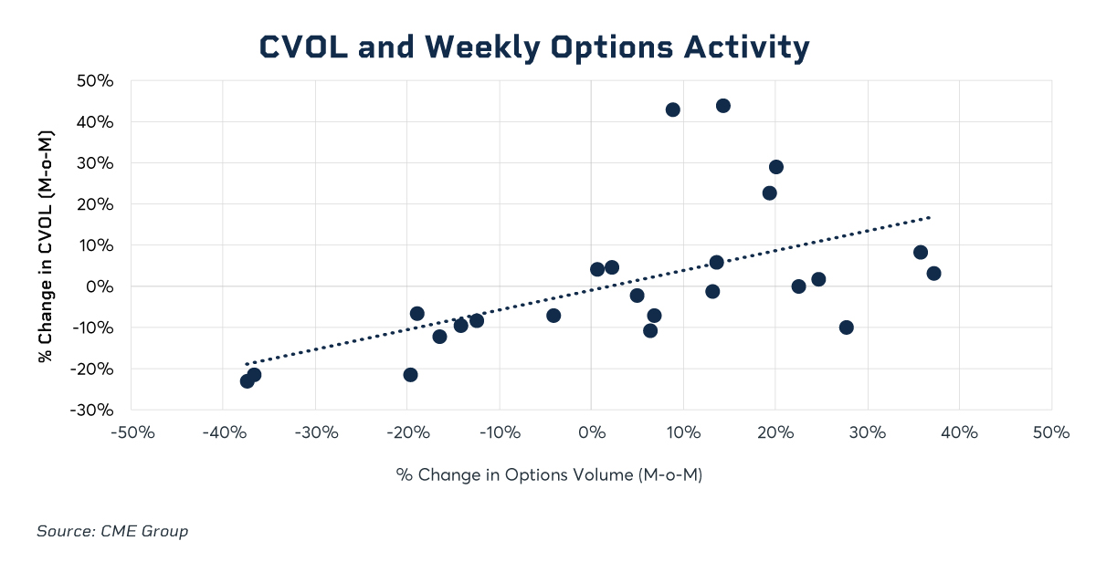 • A positive correlation between event-driven market volatility and commodity weekly options usage has emerged.