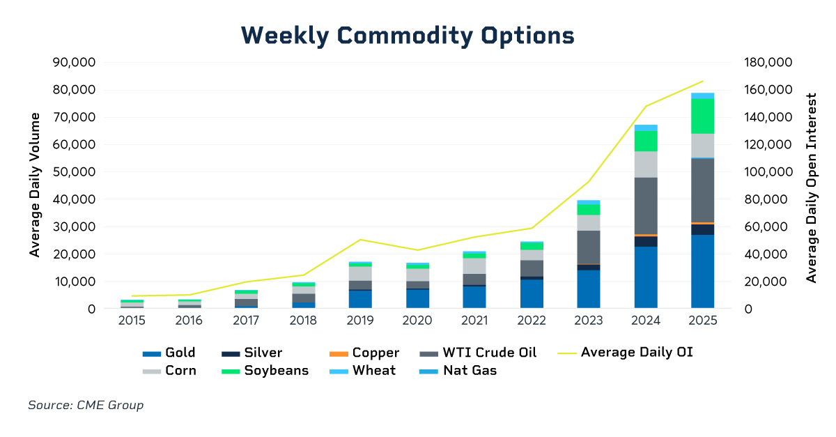 For the fifth consecutive year, trading activity in short-dated commodity options has set a new record. In 2025, the total average daily volume (ADV) for weekly options reached 79,221 contracts, a 17% increase over the previous record set in 2024.