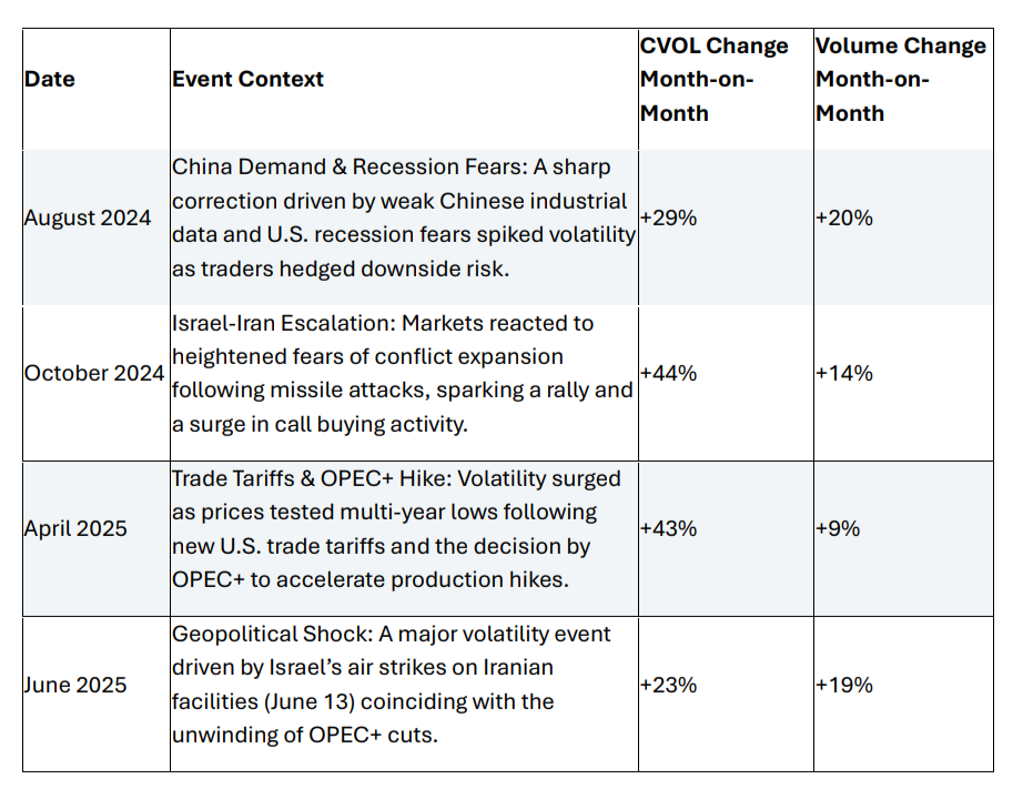 To illustrate this relationship in practice, the table below highlights four distinct periods where sharp increases in the CVOL Index coincided with increases in weekly options trading activity:
