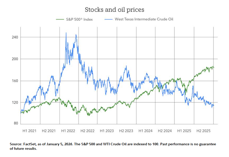 A good example of this dynamic occurred in 2025, when the S&P 500 gained 17% as crude oil lost nearly 20%—the largest annual decline in oil prices in 5 years.